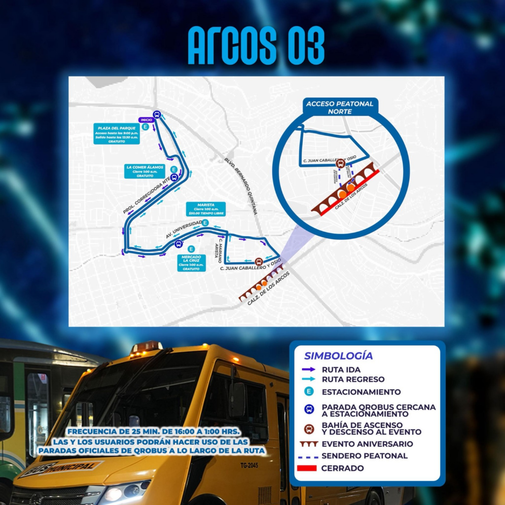 La celebración se llevará a cabo este sábado 25 de abril en Calzada de Los Arcos, por lo que se habilitarán tres rutas gratuitas: ARCOS 01, ARCOS 02 Y ARCOS 03; que operarán en un horario de 16:00 a 01:00 horas, con ascensos y descensos en las paradas oficiales de QroBus y bahías eventuales, para conectar distintos puntos estratégicos de la ciudad con la sede del evento.
