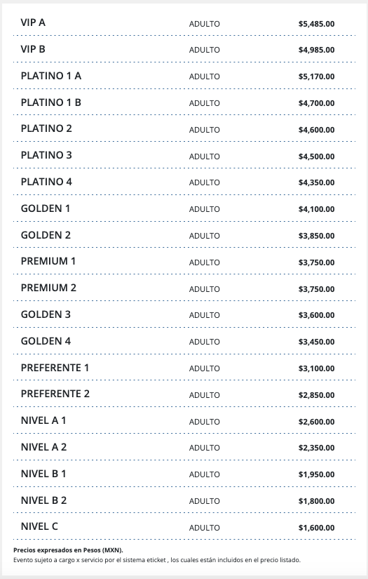Los interesados pueden consultar la disponibilidad de boletos y mayor información a través del sistema oficial eticket; te dejamos a continuación los precios; recuerda que la preventa para tarjetahabientes Banamex comenzará el 29 y 30 de abril,